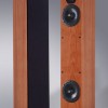 The driver complement consists of two low mass 6½ inch bass drivers and one high resolution silk soft dome tweeter in a vertical array. Each bass driver is housed in a separate chamber and is individually ported. This technique, while costly, eliminates driver interference and provides increased clarity. The upper driver is ported to the rear, while the lower driver is loaded by a downward firing port. The chambers are tuned to different frequencies to provide the smoothest and most extended inroom bass response.